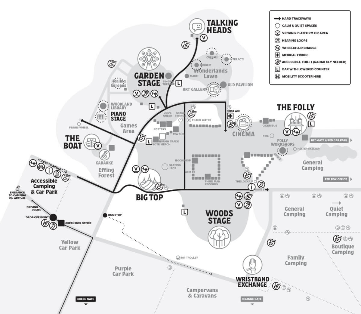 To help with access, especially in wet weather, there is a tarmac road from the Accessible Campsite which will give you backstage routes straight up to the Gardens, Joe’s Green, the Cinema, Folly Arena and into the main festival Village. In the festival Village there is a gravel road that runs past the Big Top and down to the Woods Stage.
